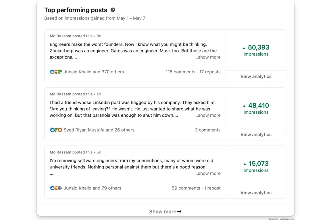 "Bekijk mijn laatste 3 Linkedin posts en meet hun engagement. Waar denk je dat ik nu over moet schrijven?"